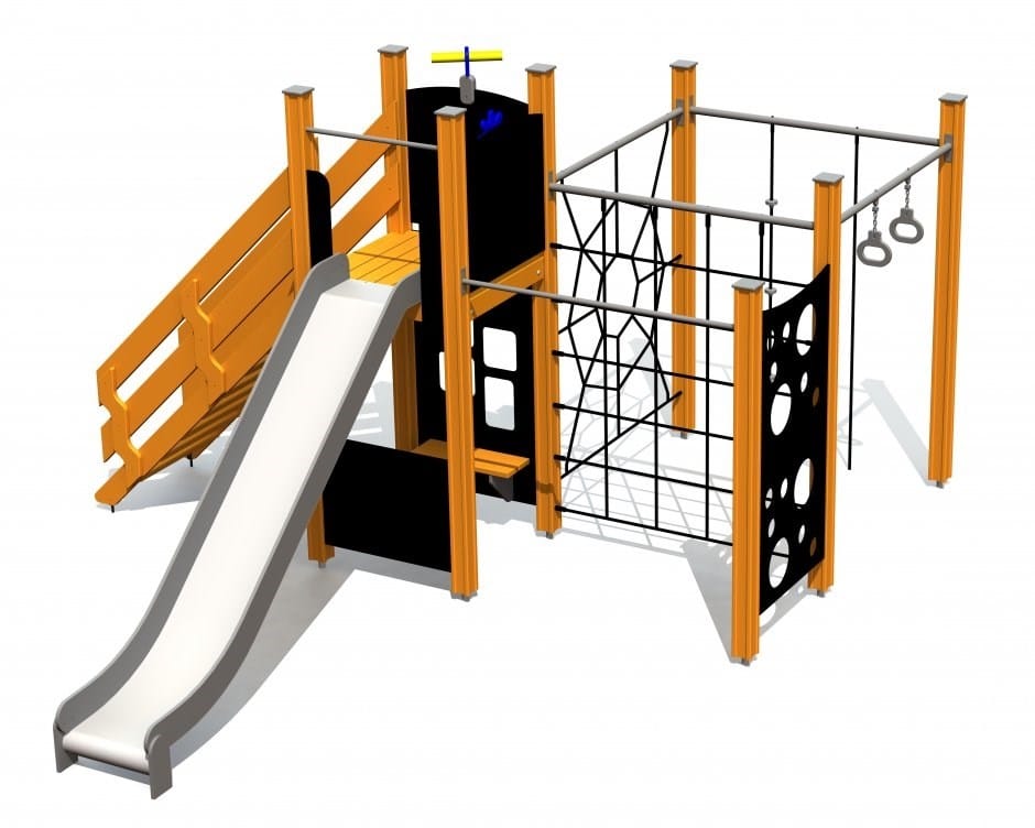 Legesystem med rutsjebane, klatrevæg, klatrenet, kravlenet, armgang, skibsrat, rampe – 155 cm til gulv