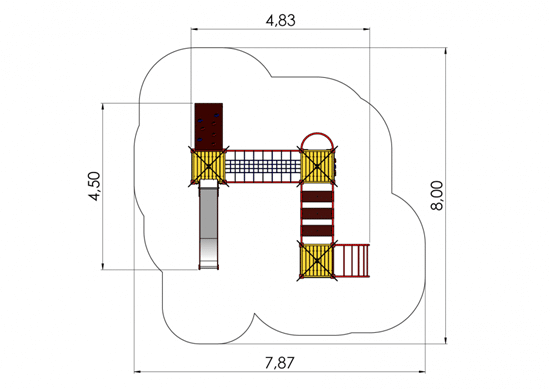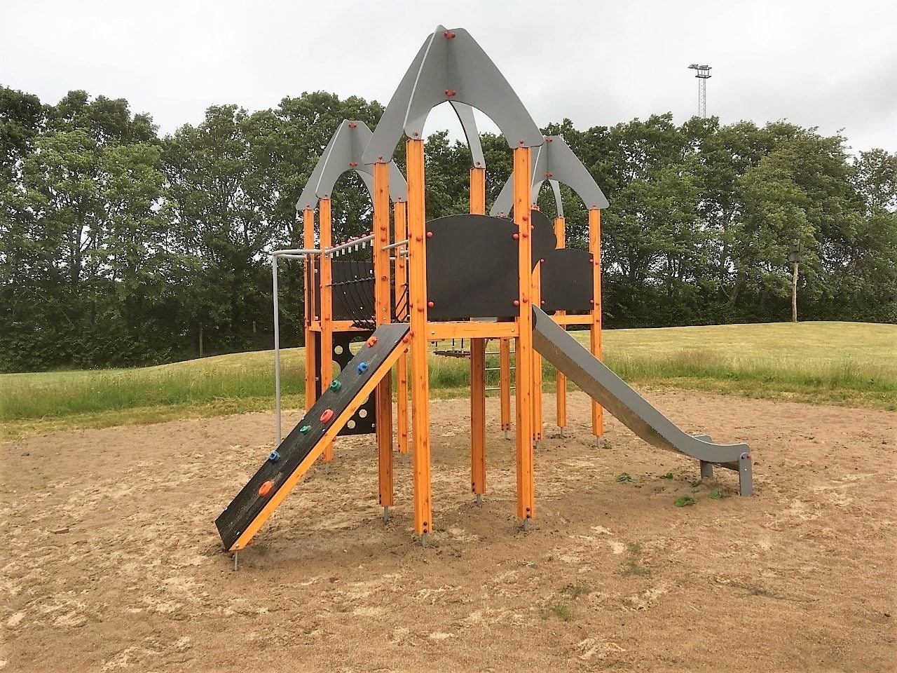Legesystem med 3 tårne, rutsjebane, rampe, netbro, klatrevæg, brandmands stang, stige, tag – 155 cm til gulve