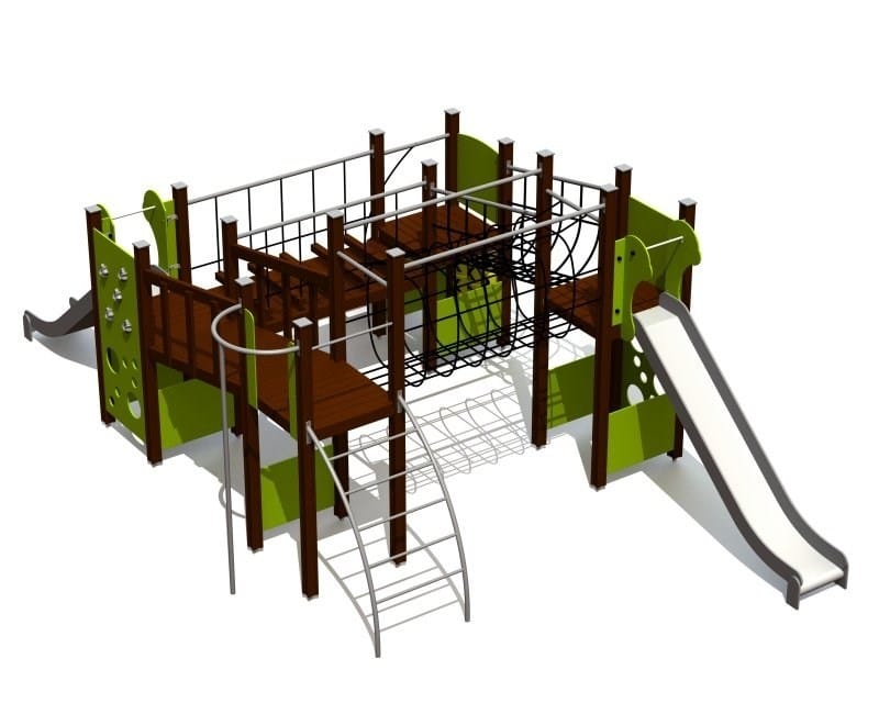Legesystem med 4 platforme, net tunnel, gangbro, trappe-gangbro, brandmandstang, klatrevæg,, 2 rutsjebaner, kryds og bolle spil, mm