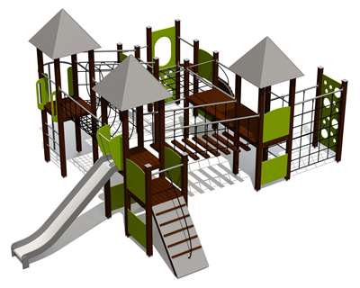 Legesystem med 3 platforme, tag, net tunnel, gangbro, trappe-gangbro, brandmandstang, klatrevægge, rutsjebane, kryds og bolle spil, mm – 155 cm til gulv